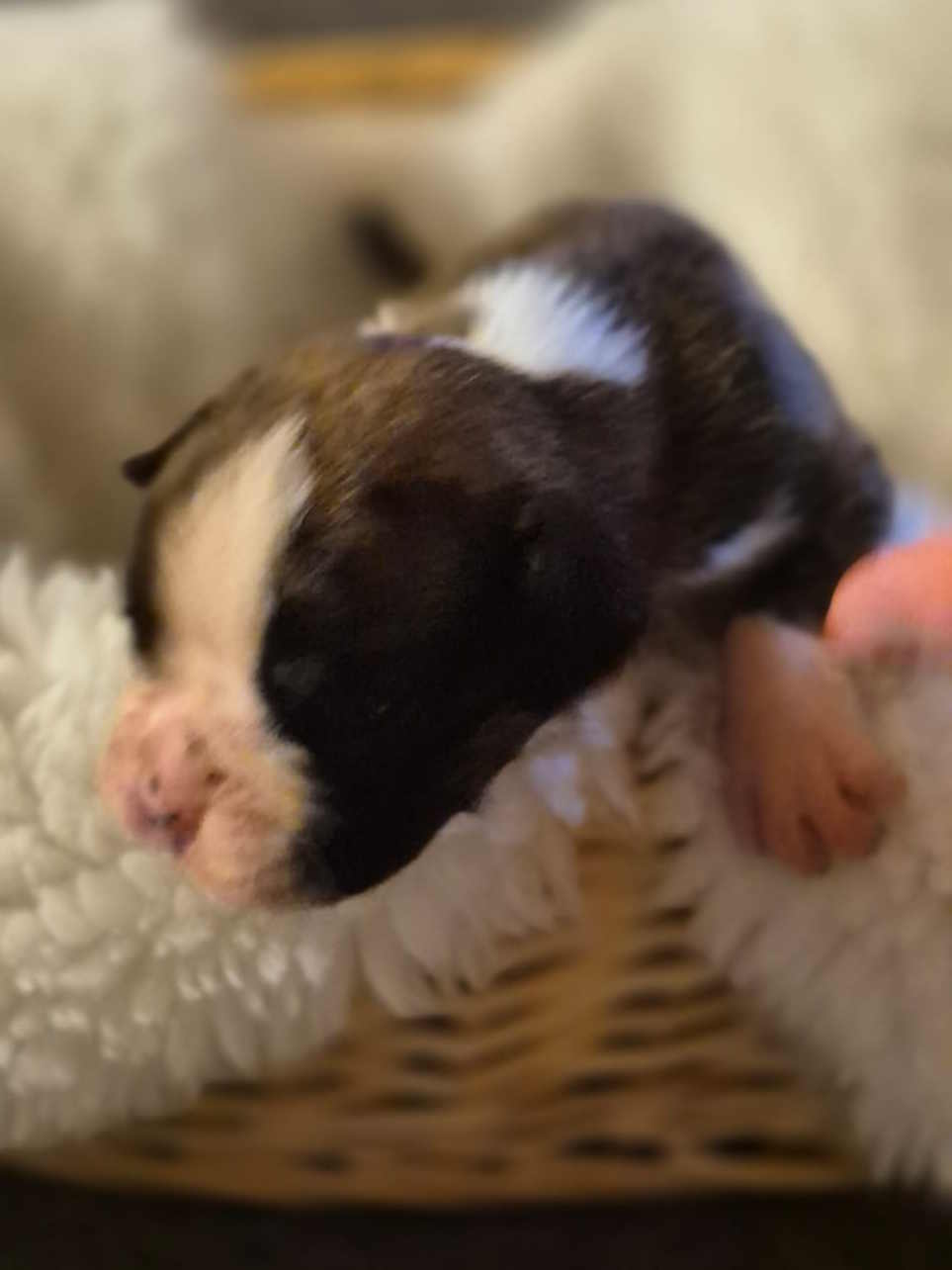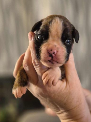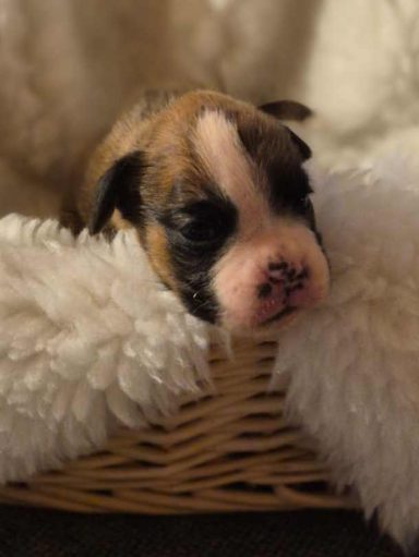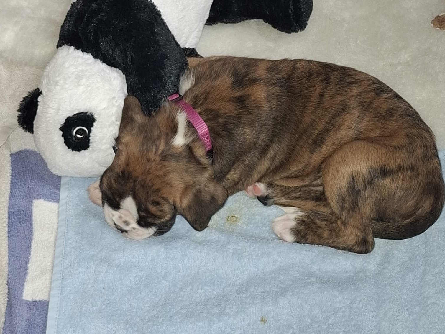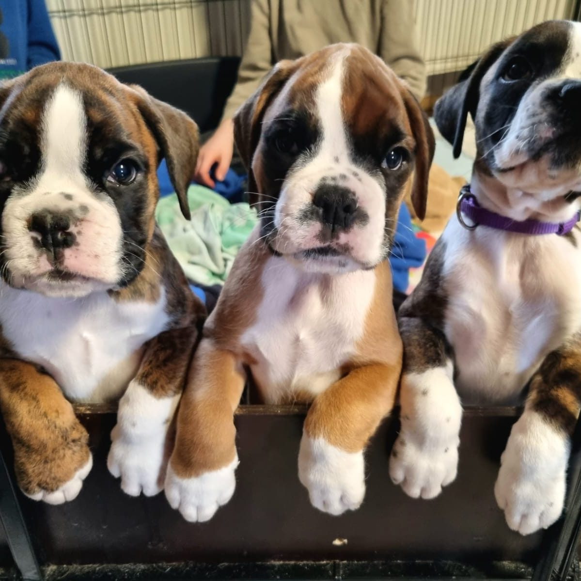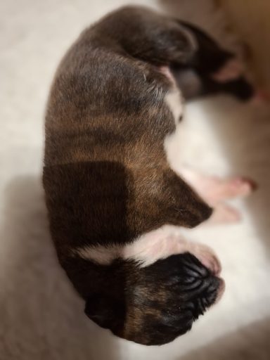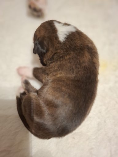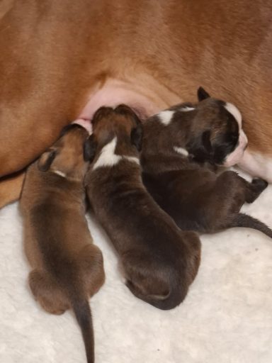 Es wurden drei gesunde Welpen geboren – drei Hündinnen in gelb und gestromt.